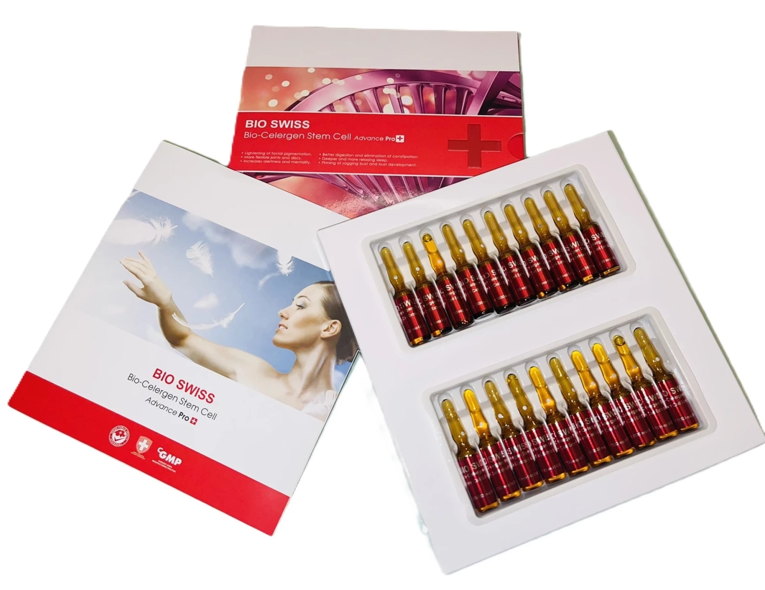 المكون الرئيسي في Bio Swiss Bio Celergen Stem Cell هو مستخلص بحري مشتق من أسماك أعماق البحار. ويعتقد أن هذا المستخلص يحتوي على خلايا جذعية ومواد نشطة بيولوجيا أخرى يمكن أن تدعم إصلاح الخلايا وتجديدها. قد تشمل المكونات الأخرى في المنتج مضادات الأكسدة والفيتامينات والمعادن، مثل فيتامين C وفيتامين E والزنك.