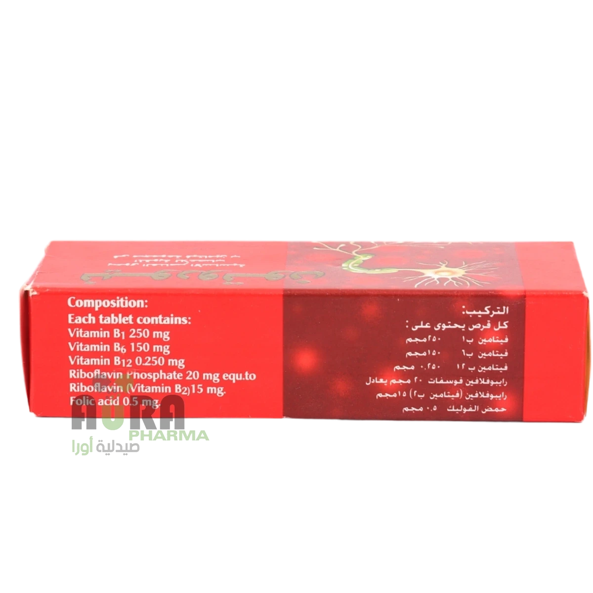 يحتوي هذا المكمل الغذائي على فيتامين ب12، فيتامين ب9، فيتامين ب6، فيتامين ب 1، فيتامين ب2. فيتامين ب9 هو أحد أشكال فيتامين ب الذائبة في الماء، يستخدم في علاج انخفاض مستويات الفولات في الدم، يستخدم أيضا في الانيميا وعدم قدرة الأمعاء على امتصاص المغذيات بشكل صحيح، تستخدمه الحامل أيضا لمنع حدوث الإجهاض أو حدوث عيوب خلقية في الجنين مثل (السنسنة المشقوقة). أما فيتامين ب12 هو فيتامين ب12 يستخدم لعلاج إنخفاض نسبة هذا فيتامين من الدم، يعد فيتامين ب12 مهم في عملية الأيض وصحة الأعصاب و الدم، إذ إن نقصه الحاد يؤدي إلى حدوث الأنيميا ومشاكل في المعدة وتلف في الأعصاب، يتوافر هذا فيتامين بشكل طبيعي في اللحوم، سمك السردين، سمك السلمون، الحليب ومنتجات الألبان.فيتامين ب 1 هو فيتامين ب1، يتوافر طبيعيا في الحبوب والمكسرات واللحوم.فيتامين ب6 هو فيتامين ب6، يستخدم في علاج العديد من المشاكل في الأعصاب، له فوائد أيضا في صحة الجلد والشعر.فيتامين ب2 هو فيتامين ب2، يساعد على امتصاص المواد الغذائية في جسم الإنسان، يستخدمه الجسم في تحويل الكربوهيدرات والدهون إلى طاقة.