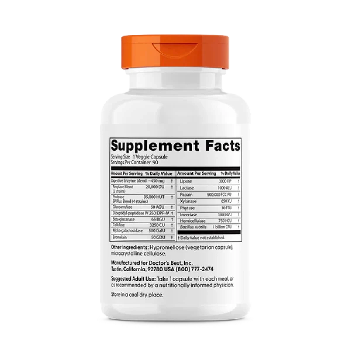 كبسولات الإنزيمات الهضمية من دكتورز بيست تحتوي على مزيج متكامل من الإنزيمات الهاضمة التي تم اختيارها بعناية لدعم الهضم اليومي. تم تصميم هذه التركيبة النباتية لتكون خالية من الجلوتين والمواد المعدلة وراثيًا، مما يجعلها مناسبة للاستخدام اليومي.