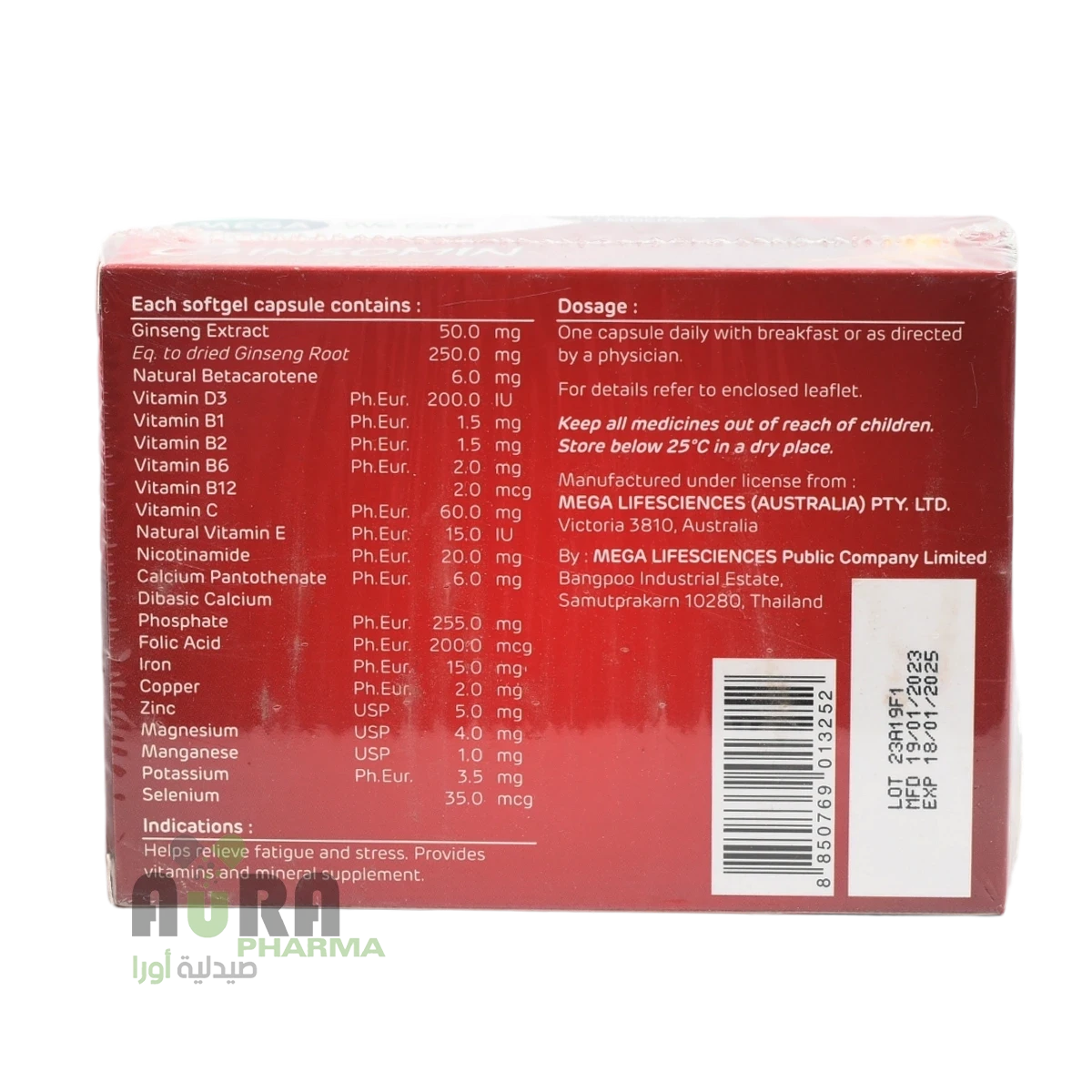 50 مجم من خلاصة نبات الجنسنج مع 11 نوع من الفيتامينات و 9 تركيبات من المعادن لعلاج التعب والإجهاد. حسّن صحتك العامة وحيويتك وقدرتك الجنسية مدى الحياة مع أقراص كوريان جنسنج الأصلية القديمة. يؤثر نبات الجنسنج الموجود في جينسومين تأثيرًا إيجابيًا في الجهاز المناعي ويزيد من مقاومة الجسم للضغط والإجهاد. تحتوي كبسولات جينسومين على مجموعة كبيرة من الفيتامينات والمعادن المهمة لأجسامنا.