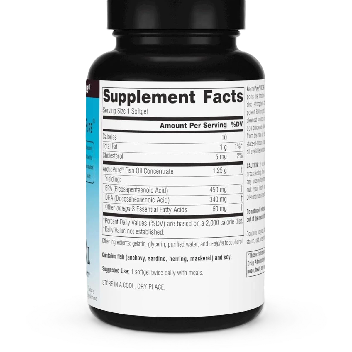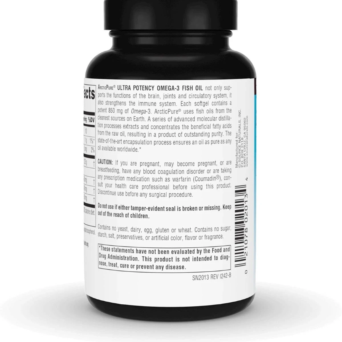 يدعم زيت السمك أوميغا-3 فائق الفعالية من سورس ناتشورالز، أركتيك بيور صحة الأمعاء والقلب والمفاصل والجهاز المناعي. يتم هضم هذه الكبسولات الهلامية المغلفة معوياً في الأمعاء، وليس في المعدة، لتوفير فوائد إضافية ومُركّزة للأمعاء الدقيقة والقولون. تحتوي كل كبسولة على 850 ملغ من أوميغا-3. تستخدم أركتيك بيور سلسلة من عمليات التقطير الجزيئي المتقدمة لاستخلاص وتركيز الأحماض الدهنية المفيدة من الزيت الخام، مما ينتج عنه نقاء فائق. خالٍ من الخميرة ومنتجات الألبان والبيض والغلوتين والقمح. خالٍ من السكر والنشا والملح والمواد الحافظة والألوان والنكهات والروائح الاصطناعية.
