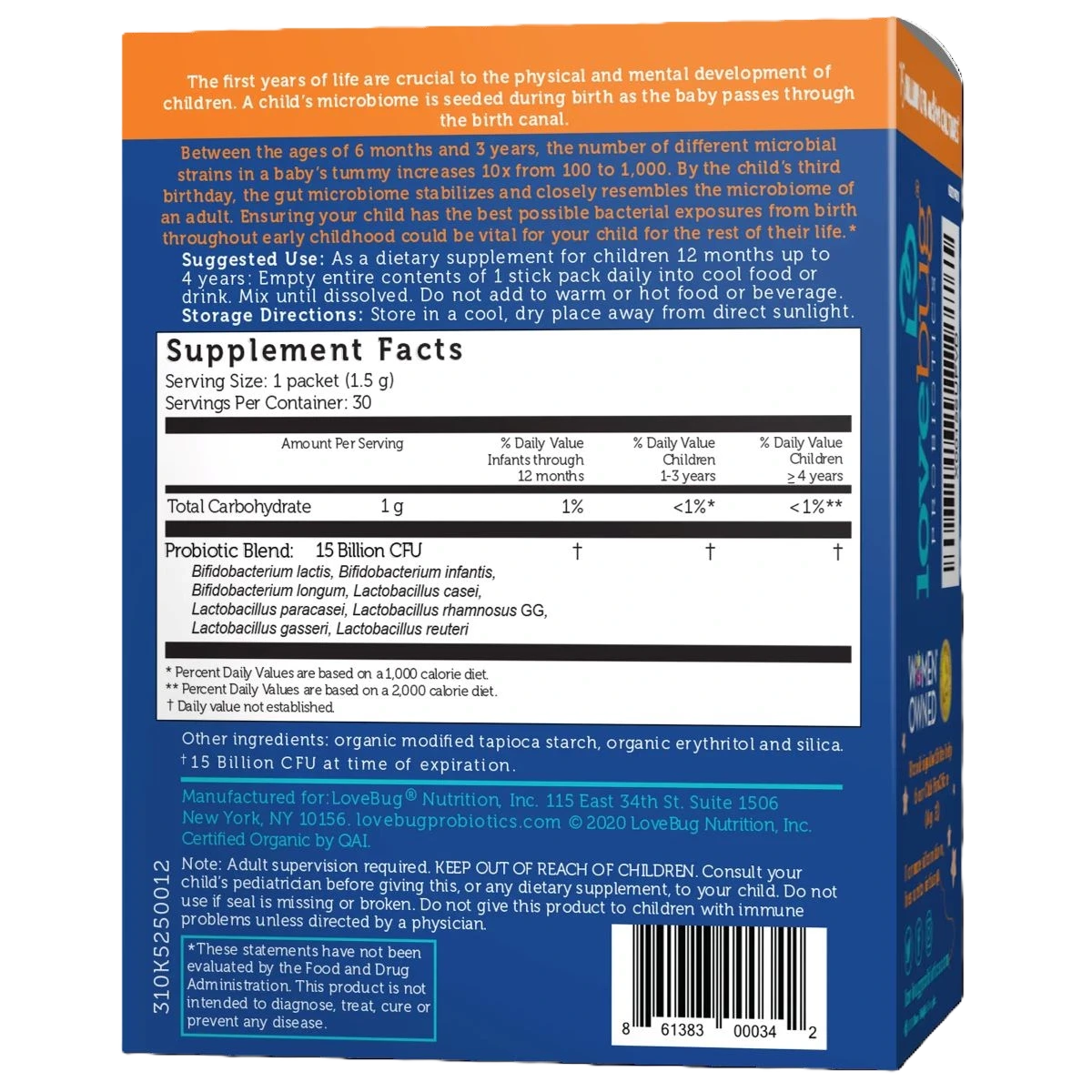 Lovebug Toddler Probiotics - بروبيوتيك عضوي للأطفال والرضع لتخفيف الإمساك، وآلام المعدة وحركات الأمعاء الناعمة، مسحوق شفاف قابل للذوبان، للأطفال من سن 12 شهرًا إلى 4 سنوات - عبوة من 30 قطعة