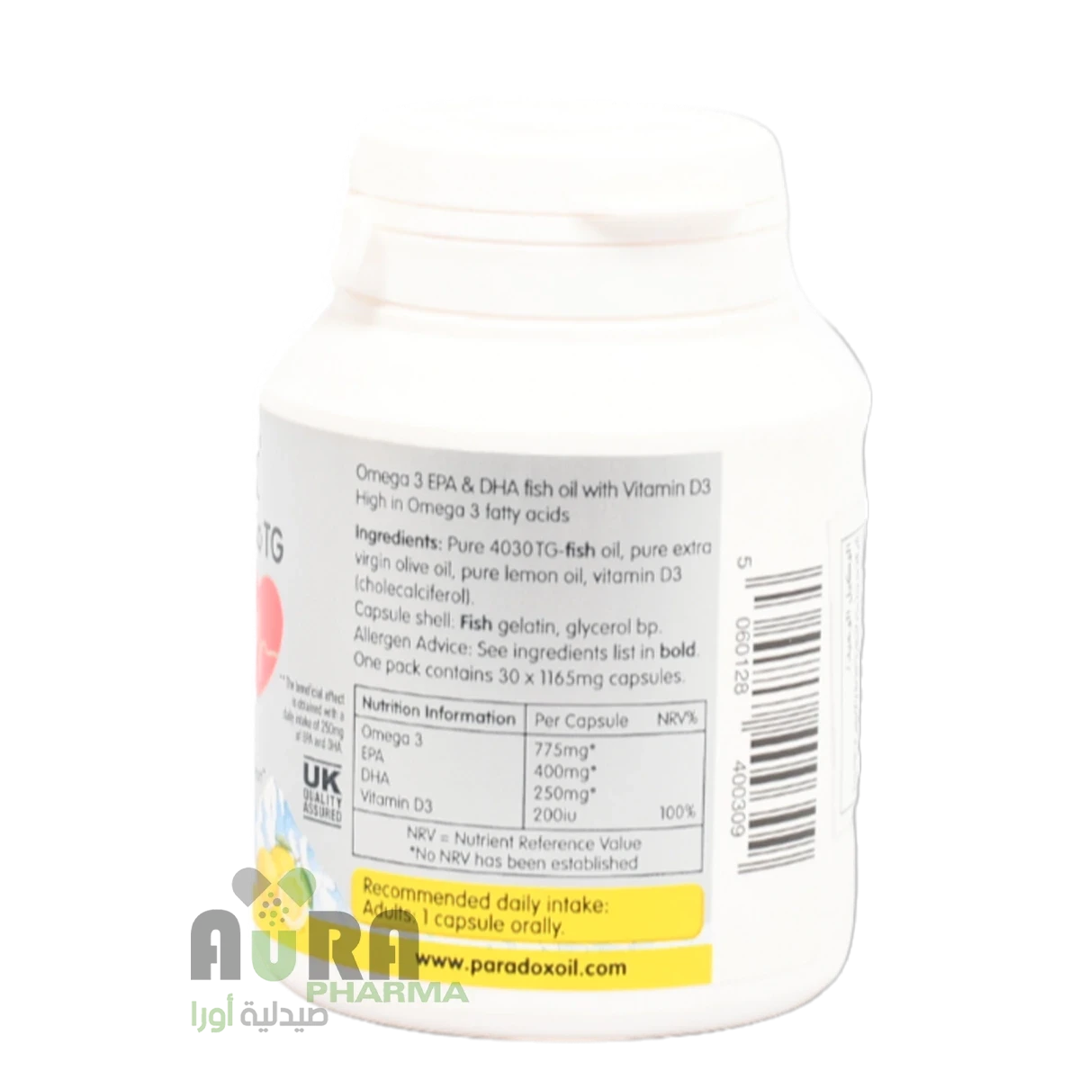 897 مجم أوميغا 3 - 775 مجم حمض إيكوسابنتينويك - 400 مجم حمض الدوكوساهيكسانويك - 250 مجم كربوهيدرات - 0 جم بروتين - 0 جم ملح - 0 جم فيتامين د3 - 5 ميكروجرام المكونات: زيت سمك نقي، زيت زيتون بكر ممتاز نقي، زيت ليمون عضوي نقي، كبسولة: جيلاتين سمك ب ب، جلسرين ب ب. التعليمات: الجرعة اليومية الموصى بها: البالغون: كبسولة واحدة. لا تتجاوز الجرعة اليومية الموصى بها. آخر: تحذير من مسببات الحساسية: يحتوي هذا المنتج على سمك. يجب على النساء الحوامل استشارة طبيبهن قبل تناول المكملات المعدنية أو الغذائية. يُحفظ بعيدًا عن متناول الأطفال الصغار. يجب عدم استخدام المكملات الغذائية كبديل لنظام غذائي متنوع ومتوازن ونمط حياة صحي.