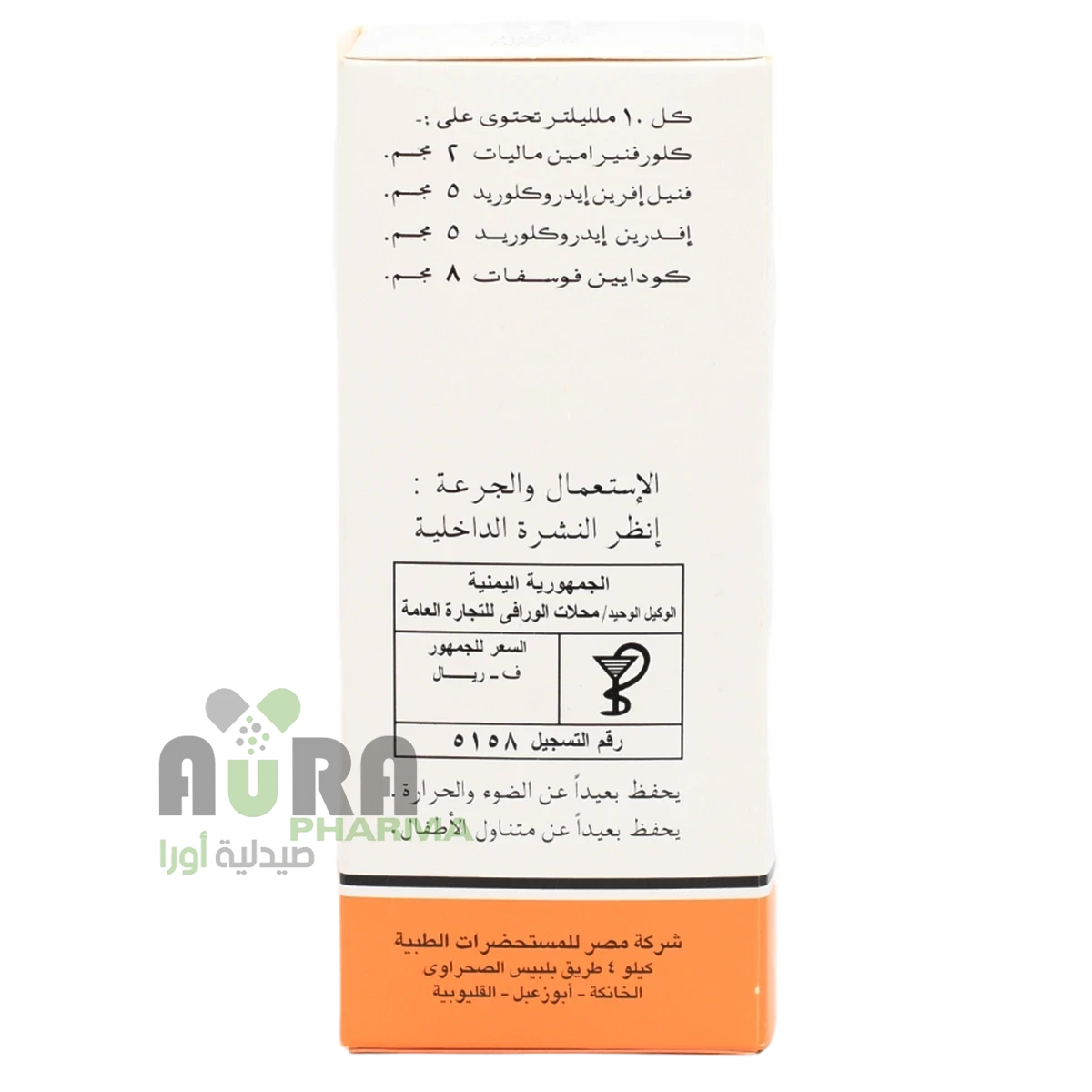 تركيبة تتكون من : كلورفينرامين مضاد هيستامين يقوم بالتخفيف من الأعراض التي يسببها الهيستامين مثل السعال، السيلان الأنفي، الحكة، الادماع ، ويستعمل لحالات حساسية الجهاز التنفسيُ العلوي تتضمن ذلك الجيوب الأنفية ، الرَمَد، و التهاب الجلد التحسسي، كودين يتم استخدام الكوديين لعلاج الألام الخفيفة والمعتدلة و لتخفيف السعال، يستخدم الكودين أيضا لعلاج الإسهال و الإسهال الناتج عن متلازمة القولون العصبي ، الايفدرين يستعمل لتخفيف الاحتقان الأنفيِ المرتبط بالجيوب الحادّة والمُزمنة و الرشح، ولمعالجة هبوط ضغط الدم الناتج عن التخدير، فينيليفرين يستخدم لعلاج انخفاض ضغط الدم في الأوعية الدموية ، باعتباره مُضيِّقُ الأوْعِية ؛ وعلاج فشل الأوعية الدموية في حالة الصدمة، والتسكين الموضعي باعتباره مُضيِّقُ الأوْعِية ؛ تسرع القلب فوق البطيني (ملاحظة : ليس للاستخدام الروتيني في معالجة تسرع القلب فوق البطيني) وموسع للحدقة في العمليات الجراحية للعين و علاج الزرق واسع الزاوية، ويستعمل ايضا دون وصفة طبية لتخفيف أعراض احتقان الأنف والبلعوم المخاطي ، تخفيف احمرار العين.